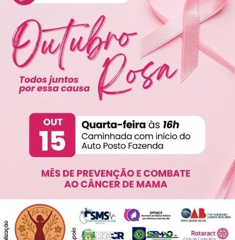 A cidade de Costa Rica se prepara para a Caminhada do Outubro Rosa 2025, promovida pela Rede Mulher de Combate ao Câncer em parceria com a Prefeitura por meio das secretarias de Saúde, Assistência Social, Agricultura e de Políticas Públicas para Mulheres. O evento, que acontece nesta quarta-feira, dia 15, às 16h, tem como objetivo sensibilizar a população sobre a importância da prevenção e do diagnóstico precoce do câncer de mama. O ponto de encontro será no pátio do Auto Posto Fazenda.