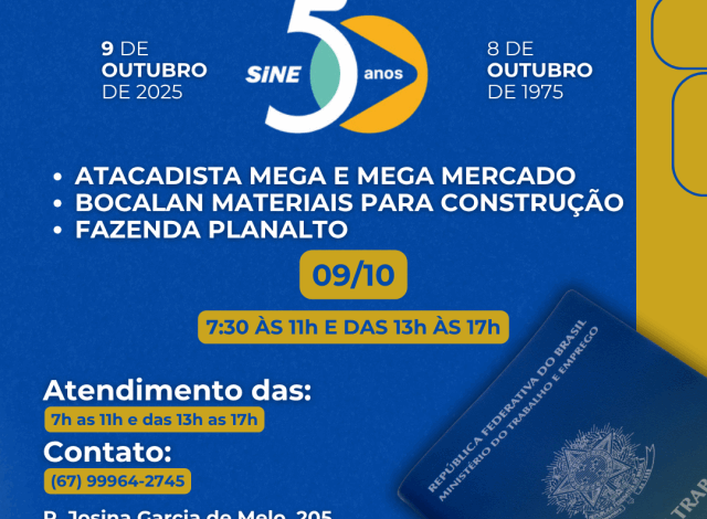 Nesta quinta-feira, 9 de outubro de 2025, a Prefeitura de Costa Rica/MS, por meio da Casa do Trabalhador vinculada à Secretaria de Desenvolvimento, realiza o Mutirão de Vagas de Emprego em comemoração aos 50 anos do SINE. Empresas como Atacadista Mega, Mega Mercado, Bocalan Materiais para Construção e Fazenda Planalto participarão do evento, que oferece diversas vagas para contratação imediata. O SINE, que completa meio século no Mato Grosso do Sul, também organiza feirões de empregabilidade em outras 12 cidades do estado, promovendo uma grande mobilização entre empresários e trabalhadores.