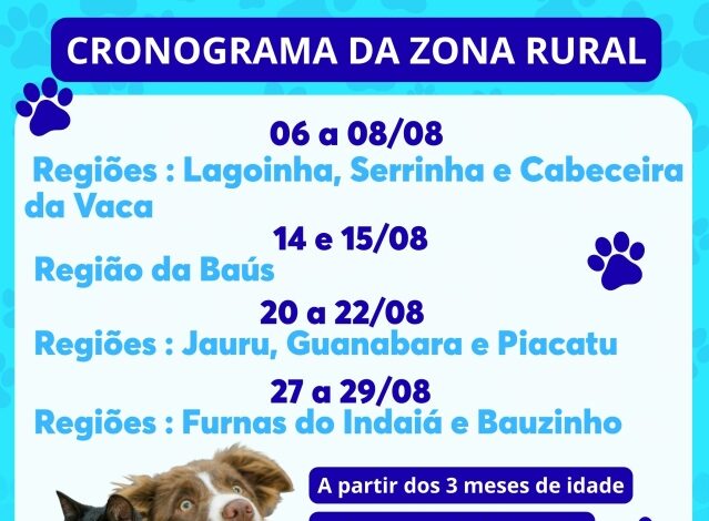 As datas definidas para a vacinação são: de 6 a 8 de agosto nas regiões da Lagoinha, Serrinha e Cabeceira da Vaca; nos dias 14 e 15 de agosto na região da Baús; de 20 a 22 de agosto nas regiões do Jauru, Guanabara e Piacatu; e por fim, de 27 a 29 de agosto nas regiões de Furnas do Indaiá e Bauzinho.
