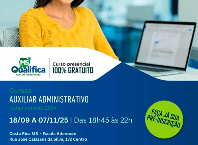 O curso de Auxiliar Administrativo, oferecido pelo programa MS Qualifica, será realizado de forma presencial em Costa Rica/MS. Com uma carga horária total de 110 horas, as aulas ocorrerão entre o período de 18 de setembro a 7 de novembro de 2025, turno noturno das 18h45 às 22h. O local das aulas será a Escola Adenocre, situada na Rua José Calazans da Silva, 172, no Centro da cidade. São 20 vagas. Inscrições abertas até dia 17 de setembro.
