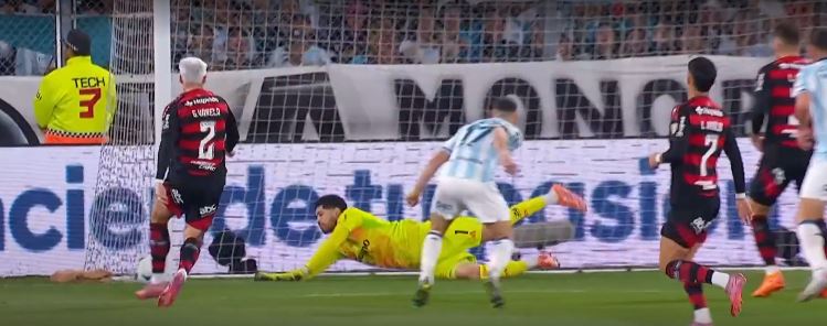 Quatro minutos depois foi a vez de Cambeses trabalhar. Após receber de Carrascal na ponta direita, Arrascaeta cruzou rasteiro para o meio da área. A bola seguiu até o lado esquerdo do ataque do Flamengo, onde Varela apareceu livre e finalizou para defesa do goleiro do Racing.