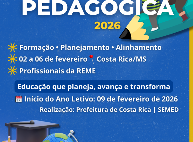 A Prefeitura de Costa Rica/MS, por meio da Secretaria Municipal de Educação (SEMED), realizará entre os dias 2 e 6 de fevereiro a Jornada Pedagógica 2026, voltada aos profissionais da Rede Municipal de Ensino (REME). O evento acontecerá nos períodos matutino e vespertino, em locais diferentes, reunindo educadores, gestores, motoristas escolares e demais servidores da Educação para momentos de formação, planejamento e alinhamento das ações pedagógicas.
