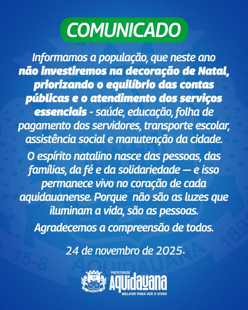 A Prefeitura de Aquidauana/MS, que está realizando um corte de gastos, incluindo a exoneração de servidores comissionados, anunciou na segunda-feira (24) que não irá investir em decorações natalinas para garantir o pagamento em dia e a manutenção de outros serviços.