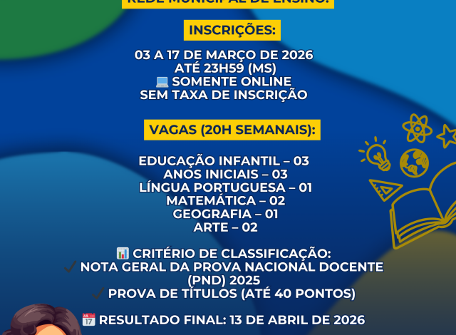 A Prefeitura de Costa Rica, por meio da Secretaria Municipal de Educação (SEMED), publicou edital de Concurso Público para provimento de cargos efetivos de professor da Rede Municipal de Ensino (REME). O certame é destinado ao preenchimento de 12 vagas no quadro permanente do magistério e terá como base a nota obtida na Prova Nacional Docente (PND) 2025. Inscrições exclusivamente pela internet, das 8h do dia 3 de março até às 23h59 do dia 17 de março de 2026.