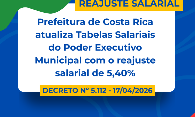 A Prefeitura de Costa Rica publicou na sexta-feira, 17 de abril de 2026, no Diário Oficial do Município, o Decreto nº 5.112, que dispõe sobre as tabelas salariais do Poder Executivo Municipal, abrangendo a administração direta e indireta. O ato normativo, assinado pelo prefeito delegado Cleverson Alves dos Santos, estabelece a atualização dos vencimentos dos servidores públicos municipais, com efeitos retroativos a fevereiro de 2026.