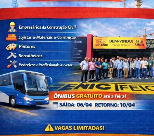 Além do transporte, os profissionais devem realizar o credenciamento gratuito para a Feicon 2026, disponível até o dia 22 de março. Após essa data, o acesso pode estar sujeito a cobranças conforme as regras da organização do evento.