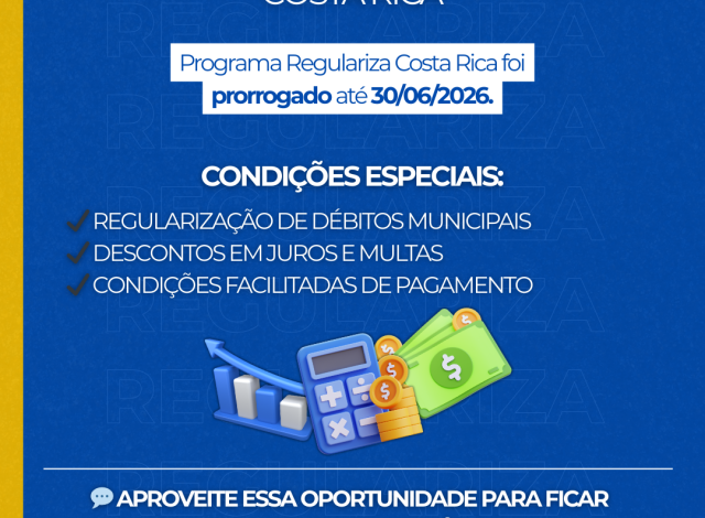 A Prefeitura de Costa Rica prorrogou o prazo do Programa Regulariza Costa Rica, que auxilia contribuintes na quitação de débitos municipais. A ampliação do período foi autorizada pela Lei Complementar nº 137, de 22 de dezembro de 2025, que alterou a Lei Complementar nº 126, de 3 de abril de 2025. Com isso, o prazo final, que antes se encerrava em 31 de dezembro de 2025, passou a vigorar até 30 de junho de 2026.