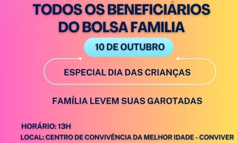 Nesta sexta-feira, 10 de outubro de 2025, às 13h, o Centro de Convivência do Idoso (CONVIVER), no bairro Sonho Meu II, recebe reunião socioeducativa, Especial Dia das Crianças, destinada à todas as famílias beneficiárias do Programa Bolsa Família. A iniciativa é promovida pela Prefeitura de Costa Rica, em parceria da Secretaria de Assistência Social com secretarias de Educação e de Saúde, com o Centro de Referência de Assistência Social (CRAS). A participação é obrigatória para garantir o cumprimento das condicionalidades do programa do Governo Federal.