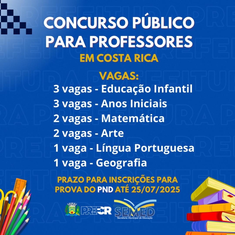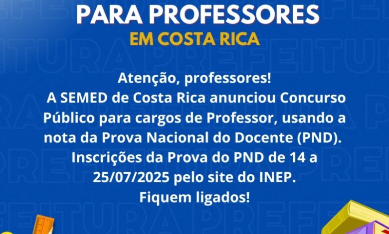 A Secretaria Municipal de Educação (SEMED) de Costa Rica anunciou que realizará um Concurso Público para cargos de Professor, utilizando a nota da Prova Nacional do Docente (PND) como parte da avaliação. As inscrições para a PND estarão abertas de 14 a 25 de julho de 2025, e devem ser feitas pelo site do INEP: https://pnd.inep.gov.br/pnd/. Todos que desejam participar do concurso devem se inscrever e realizar a PND, pois a nota será utilizada na seleção dos candidatos. Locais mais próximos para fazer as provas: Coxim, Três Lagoas e Campo Grande, além de Mineiros/GO.