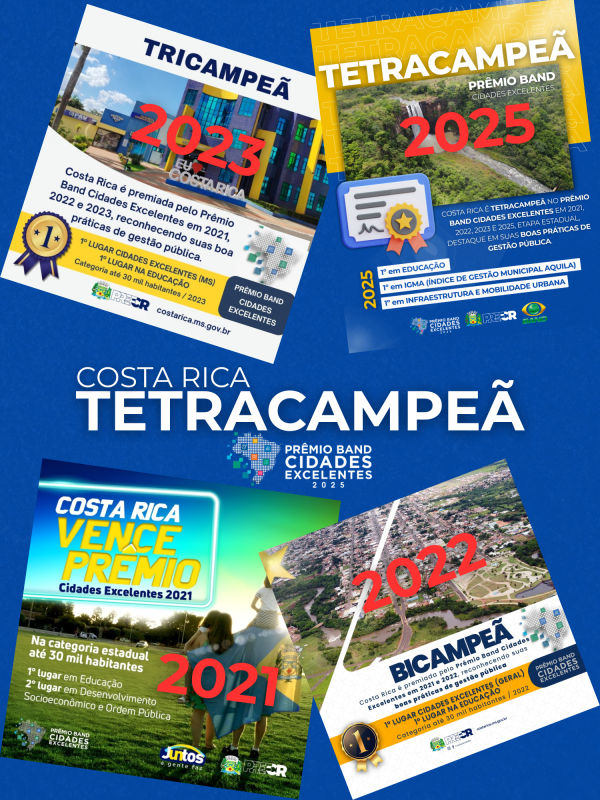 A cidade com 28.740 habitantes foi premiada quatro vezes na categoria de municípios com até 30 mil habitantes, destacando-se no Índice de Gestão Municipal Aquila (IGMA), que avalia a eficiência e a qualidade dos serviços públicos. Em 2025, Costa Rica se sagrou tetracampeã no algoritmo de consolidação final e foi finalista nas categorias de Educação e Infraestrutura e Mobilidade Urbana, evidenciando a sinergia entre o fomento ao empreendedorismo e os investimentos em saúde, educação e infraestrutura.