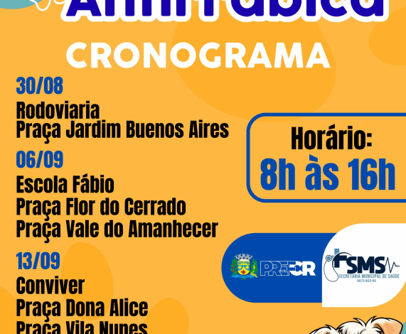 A vacinação ocorrerá em horários das 8h às 16h em diferentes datas e locais: 30 de agosto na Rodoviária e na Praça Moacir Rodrigues; 6 de setembro na Escola Fábio, Praça Flor do Cerrado e Praça do Vale do Amanhecer; 13 de setembro no Conviver, Praça Dona Alice e Praça Joaquim Nunes; e 20 de setembro na Praça Central Manoel Romualdo Gonçalves, Praça Jornalista Cláudia Carvalho e Praça Angelina Gonçalves Martins.